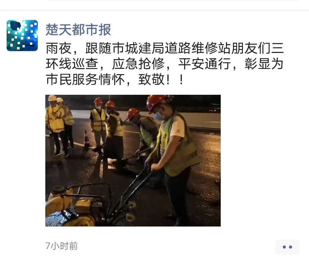 ? ? ? 近日,武漢市陰雨連綿,許多路段因雨水浸泡、車輛碾壓等出現(xiàn)坑凼,嚴(yán)重影響了交通安全。為保障雨季市民行車安全,助力高考考生赴考通暢,7月以來,漢陽市政六公司24小時(shí)全天候巡查排險(xiǎn),提前預(yù)防、提前搶修,積極修復(fù)受損路段,做到應(yīng)急搶修不斷檔,獲得了民眾的一致好評(píng),并被《長(zhǎng)江日?qǐng)?bào)》《武漢晨報(bào)》《武漢晚報(bào)》《楚天都市報(bào)》等主流媒體報(bào)道。
