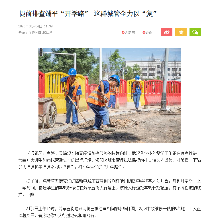 ? ? ? 近日,漢陽市政維修一隊負責的漢陽區(qū)內(nèi)日常道路維修工作,先后受到漢陽知音、鳳凰網(wǎng)湖北綜合、長江日報等主流媒體的一致好評。此前,漢陽市政維修一隊道路維修工作也曾多次獲媒體正面報道。
