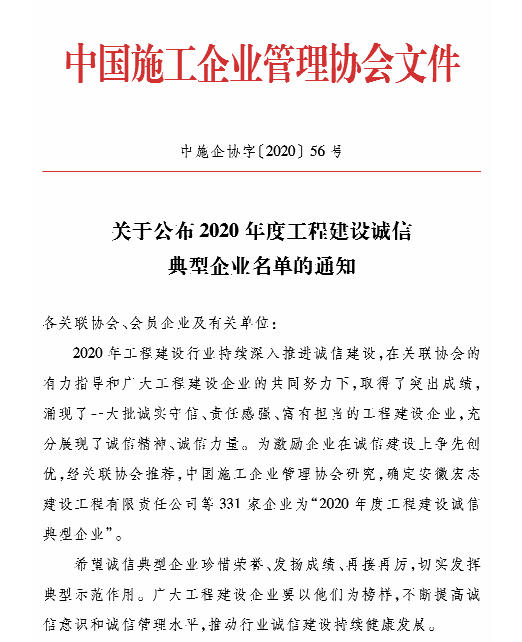 ? ? ? 2020年工程建設(shè)行業(yè)持續(xù)深入推進(jìn)誠信建設(shè),廣泛開展行業(yè)信用評價工作。近日,中國施工管理協(xié)會公布了“2020年度第一批工程建設(shè)企業(yè)信用評價”和“2020年度工程建設(shè)誠信典型企業(yè)”名單,漢陽市政多個公司獲評榮譽(yù)。