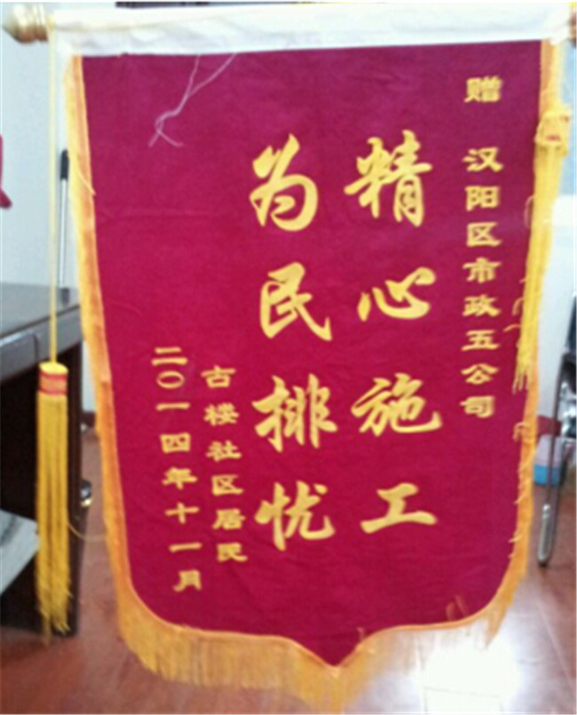 今年,五公司負責(zé)2014年老舊社區(qū)道路維修工程。該工程包括古樓社區(qū)、水仙里社區(qū)、墨北社區(qū)等多個社區(qū),迄今為止已完成步磚面積約為1000㎡,工程質(zhì)量受到社區(qū)居民和建設(shè)單位的好評。12月1日,古樓社區(qū)居民代表,將一面“精心施工、為民排憂”的錦旗贈與了五公司,感謝五公司工程部為古樓社區(qū)作出的貢獻。