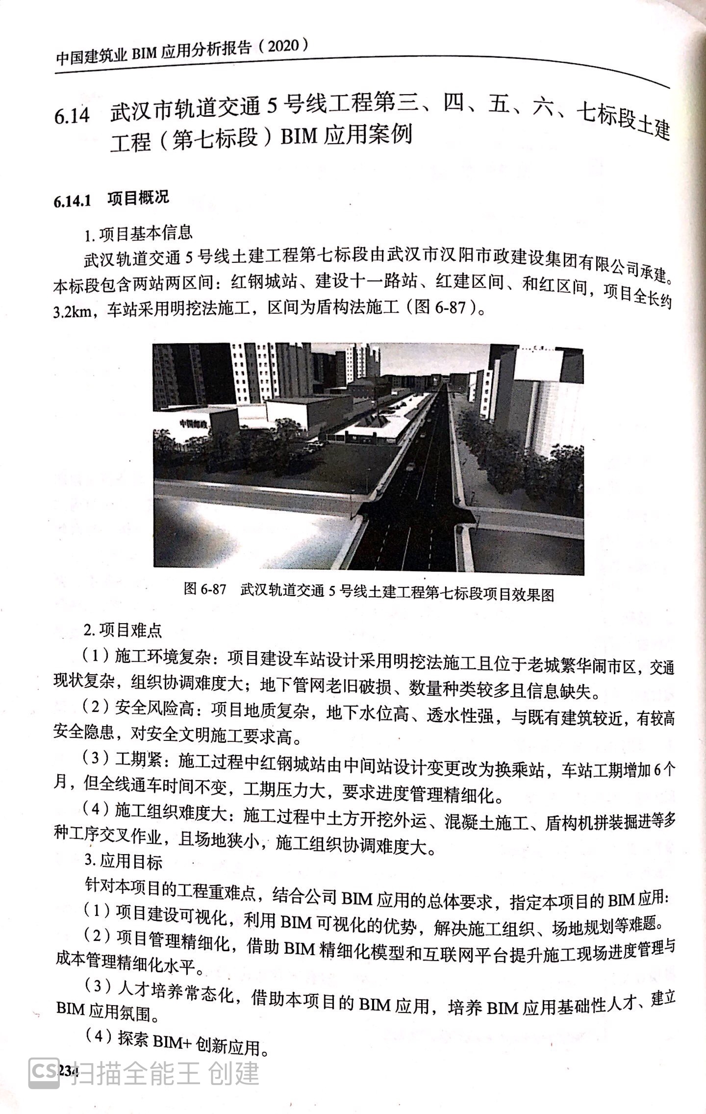《報(bào)告》第6章BIM技術(shù)應(yīng)用典型案例匯編章節(jié)中,以漢陽(yáng)市政四公司承建的“武漢市軌道交通5號(hào)線第七標(biāo)段土建工程BIM技術(shù)應(yīng)用成果”為典型案例,進(jìn)行展示與分析。此章節(jié)從項(xiàng)目概況、BIM應(yīng)用方案、BIM實(shí)施過(guò)程、BIM應(yīng)用效果總結(jié)四個(gè)方面,對(duì)5.7標(biāo)項(xiàng)目BIM技術(shù)應(yīng)用情況進(jìn)行了全面且詳細(xì)的介紹。