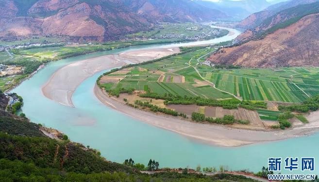 云南省麗江市石鼓鎮(zhèn)綠樹和農(nóng)田掩映下的“長江第一灣”(來源:新華網(wǎng))