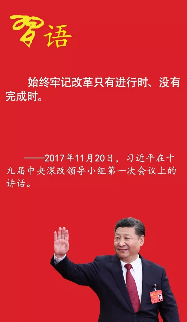——這是習(xí)近平總書記在十九屆中央深改領(lǐng)導(dǎo)小組第一次會(huì)議上的講話。此前,“改革只有進(jìn)行時(shí)、沒(méi)有完成時(shí)”的論述已廣為人知,但此次加上“始終牢記”4個(gè)字,進(jìn)一步彰顯出黨的十九大繼續(xù)推進(jìn)全面深化改革的堅(jiān)定決心。