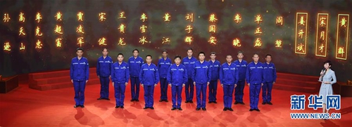 中船重工第七六〇研究所抗災搶險英雄群體中的14位同志(另外3位同志犧牲)參加發(fā)布儀式(9月11日攝)。新華社記者 李賀攝
