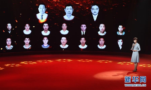 在主持人(右一)的引導下,中船重工第七六〇研究所抗災搶險英雄群體中的14位同志(另外3位同志犧牲)參加發(fā)布儀式(9月11日攝)。新華社記者 李賀攝