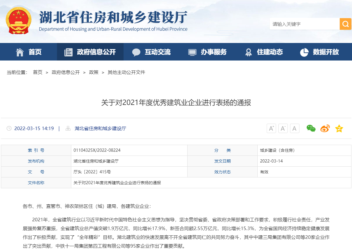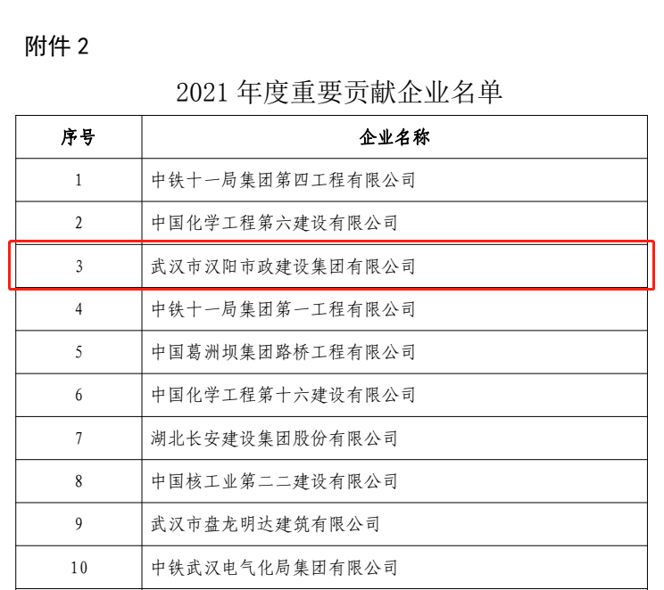 ? ? 3月15日,湖北省住建廳公布115家優(yōu)秀建筑業(yè)企業(yè)名單,揭曉2021年度突出貢獻(xiàn)企業(yè)和重要企業(yè)評選結(jié)果,漢陽市政獲評“2021年度重要貢獻(xiàn)企業(yè)”,獲通報表揚(yáng)。