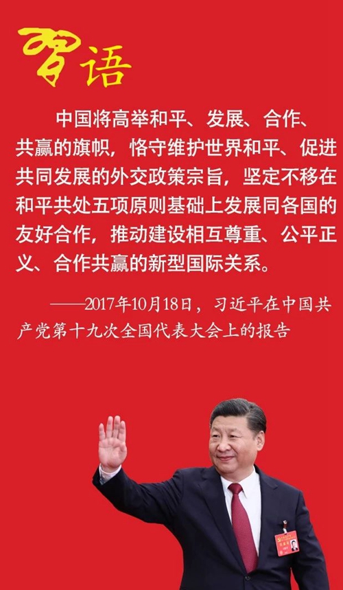 中國將高舉和平、發(fā)展、合作、共贏的旗幟,恪守維護世界和平、促進共同發(fā)展的外交政策宗旨,堅定不移在和平共處五項原則基礎(chǔ)上發(fā)展同各國的友好合作,推動建設(shè)相互尊重、公平正義、合作共贏的新型國際關(guān)系。