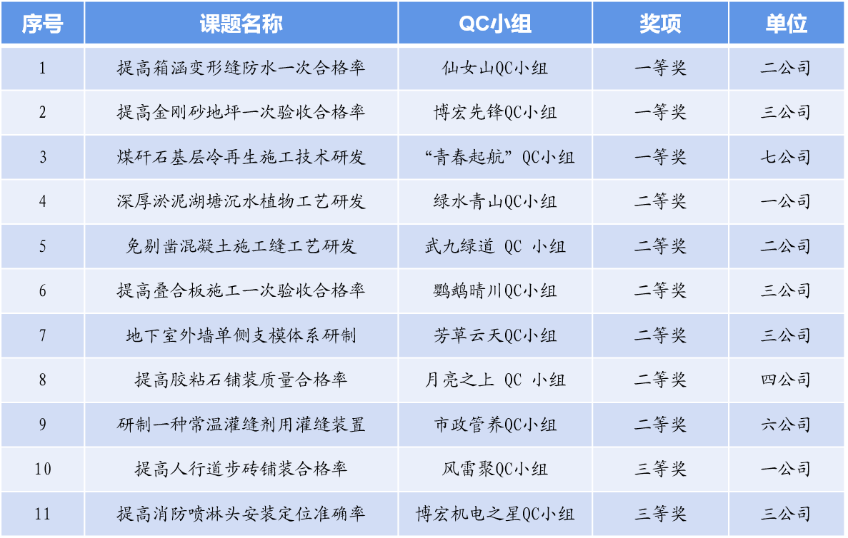 近日,由中國施工企業(yè)管理協(xié)會主辦的2022年度工程建設(shè)質(zhì)量管理小組活動復(fù)賽和決賽順利落幕,漢陽市政選送的11項優(yōu)秀QC成果在全國參賽成果中脫穎而出,均斬獲大獎。其中3項成果榮獲一等獎,6項成果榮獲二等獎,2項成果獲三等獎。這是公司首次獲得該類成果一等獎,標(biāo)志著工程質(zhì)量管理再上新臺階。