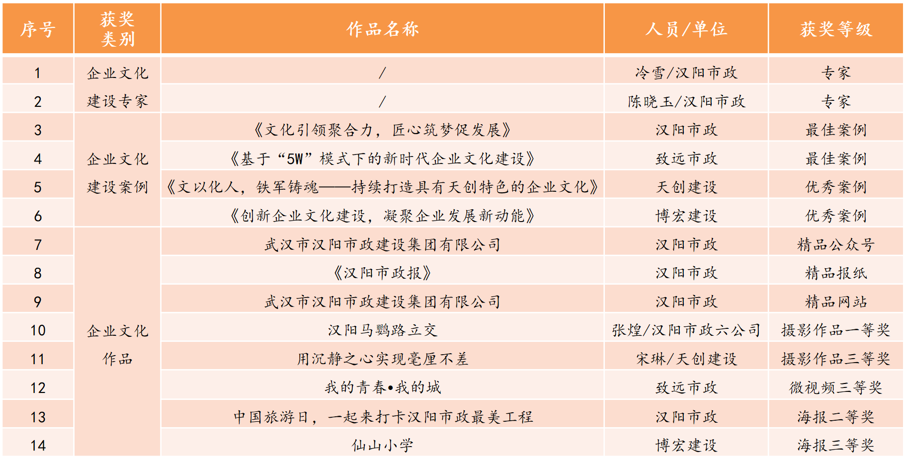 近日,中國施工企業(yè)管理協(xié)會發(fā)布《關(guān)于公布第二批工程建設(shè)企業(yè)文化建設(shè)專家的通知》《關(guān)于公布工程建設(shè)企業(yè)文化建設(shè)最佳案例和優(yōu)秀案例的通知》《關(guān)于公布2022年工程建設(shè)企業(yè)文化作品競賽結(jié)果的通知》,漢陽市政斬獲14項企業(yè)文化建設(shè)類榮譽!