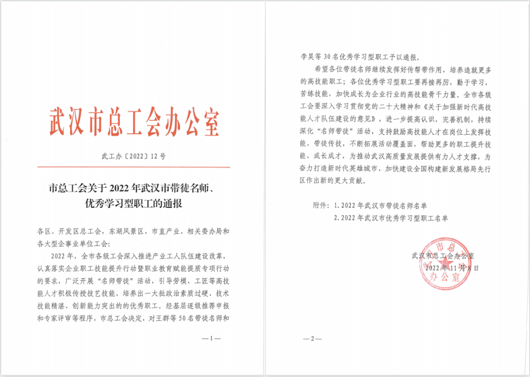 師徒結(jié)對傳匠心,青藍相接鑄輝煌。2022年11月8日,根據(jù)武漢市總工會辦公室發(fā)布的《市總工會關(guān)于2022年武漢市帶徒名師、優(yōu)秀學習型職工的通報》,漢陽市政羅明飛、李子豪、陳文獲評“武漢市帶徒名師”,林志剛、易曉輝獲評“武漢市優(yōu)秀學習型職工”。