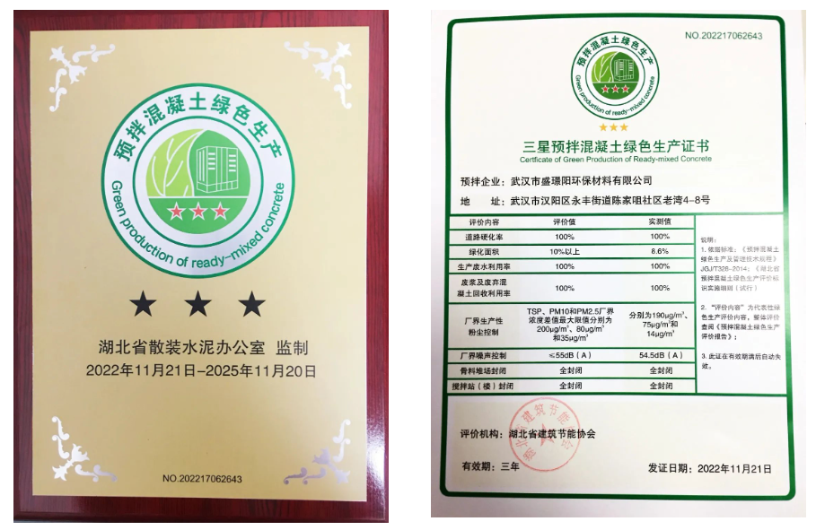 ? ? 近日,喜報(bào)傳來(lái),漢陽(yáng)市政盛璟陽(yáng)公司順利通過(guò)評(píng)審程序,相繼取得了“三星預(yù)拌混凝土綠色生產(chǎn)評(píng)價(jià)證書(shū)”及“綠色建材三星認(rèn)證證書(shū)”,成為一家榮獲“綠色生產(chǎn)+綠色建材”雙三星認(rèn)證企業(yè)。