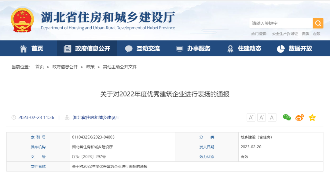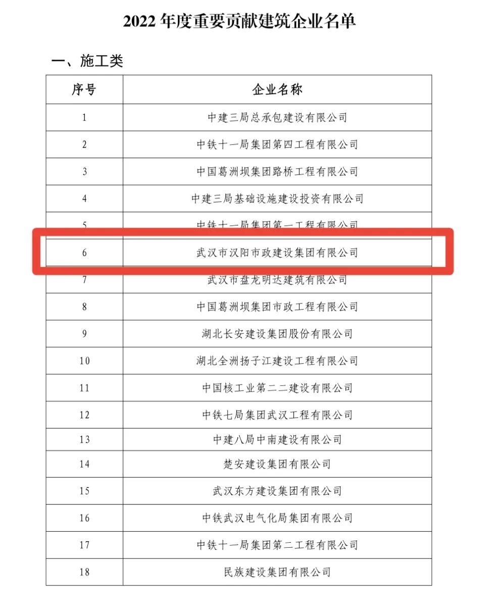 2月23日,湖北省住房和城鄉(xiāng)建設(shè)廳召開全省建筑業(yè)發(fā)展與管理工作會(huì)議,會(huì)上通報(bào)表揚(yáng)26家突出貢獻(xiàn)企業(yè)和114家重要貢獻(xiàn)企業(yè)。漢陽市政榜上有名,獲評“湖北省2022年度重要貢獻(xiàn)建筑企業(yè)”。