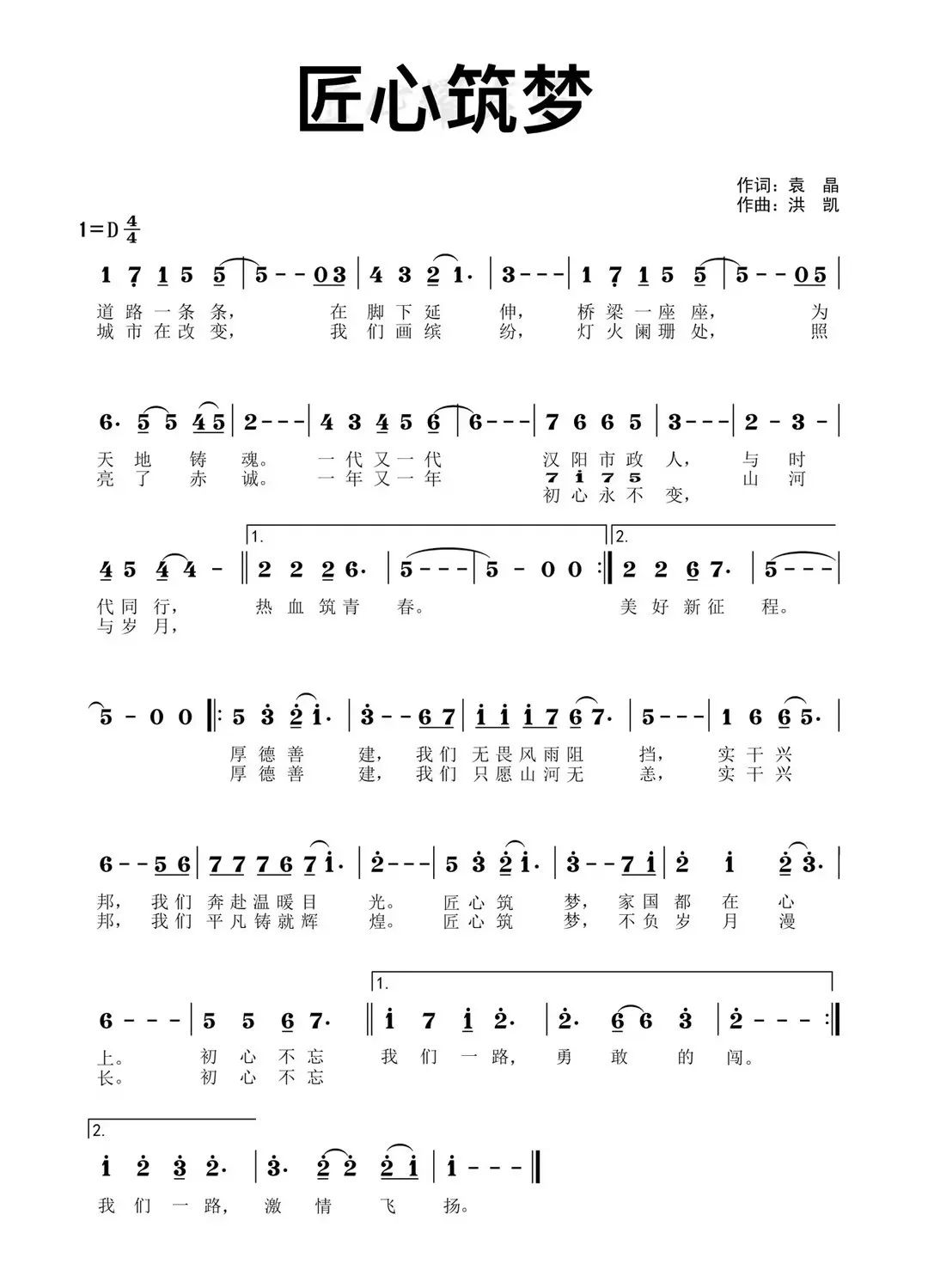 ? ?《匠心筑夢》由袁晶作詞,洪凱作曲,節(jié)奏鏗鏘有力、雄壯昂揚,氣勢熱情澎湃、朝氣蓬勃。司歌承載著漢陽市政人為國為民盡心盡責(zé)的不變初心,唱響了新一代漢陽市政青年不負(fù)歲月用熱血繪就美好藍(lán)圖的壯志豪情。